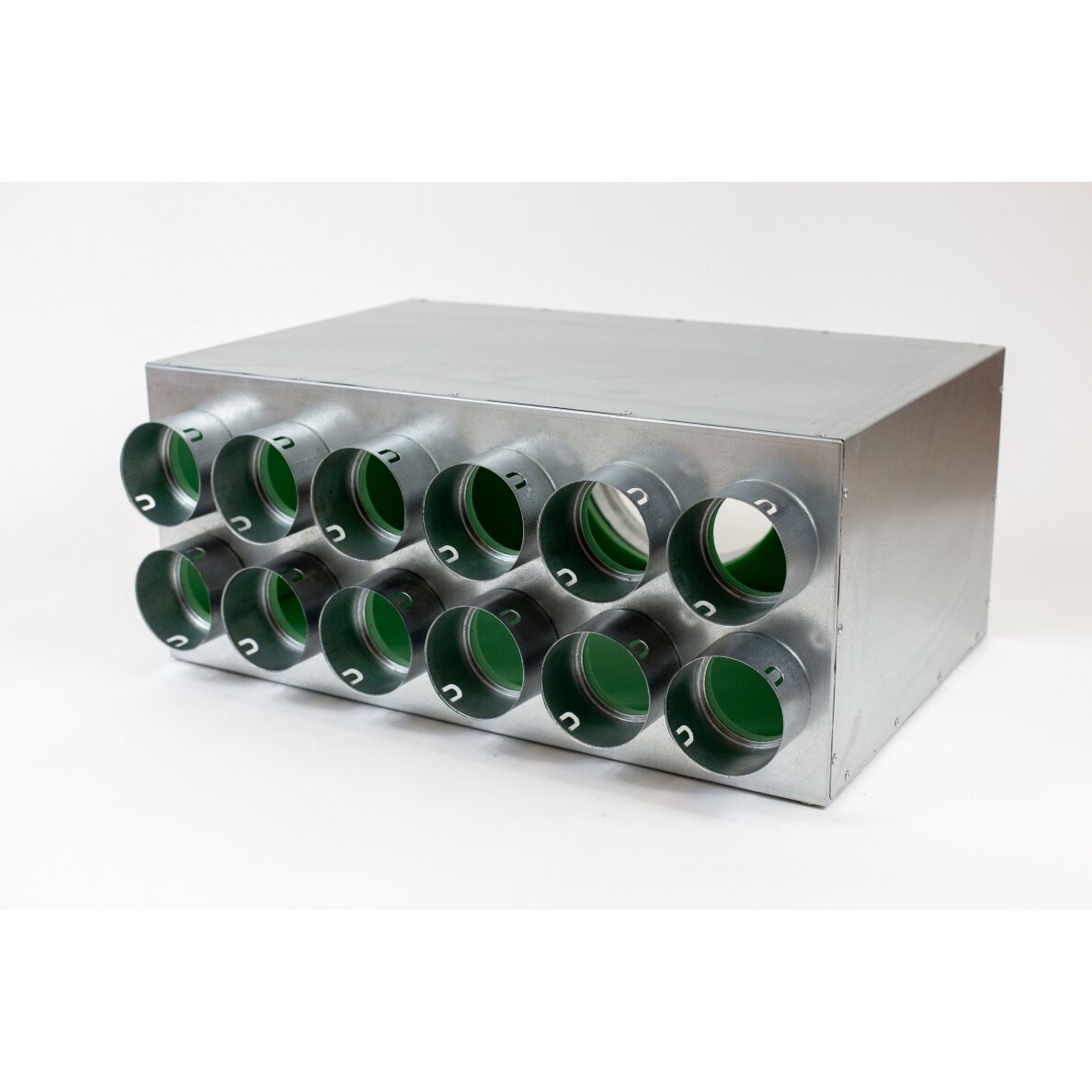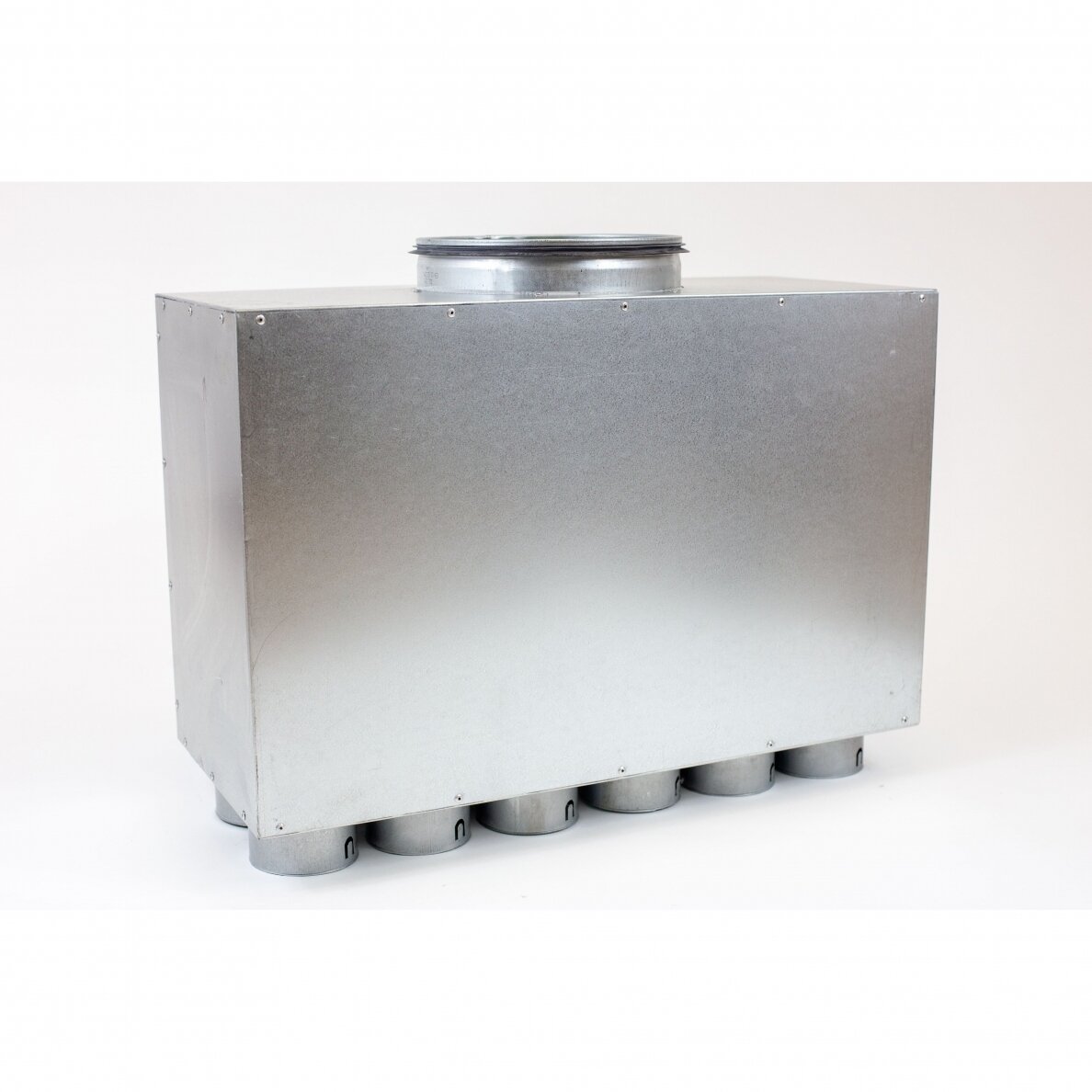 Horizontalaus pajungimo oro paskirstymo dėžė pagaminta iš cinkuoto lakštinio plieno, vidus padengtas termine izoliacija triukšmui sumažinti.